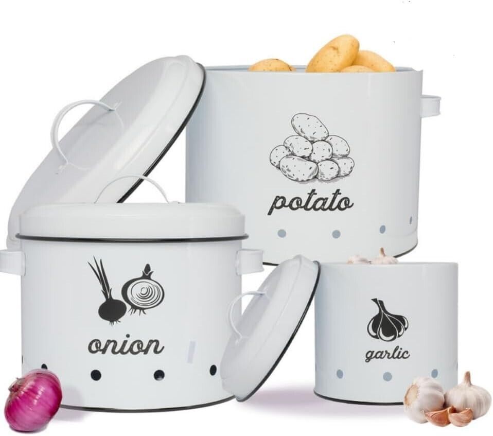 3-in-1 Large White Potato, Onion & Garlic Tin Storage Canisters