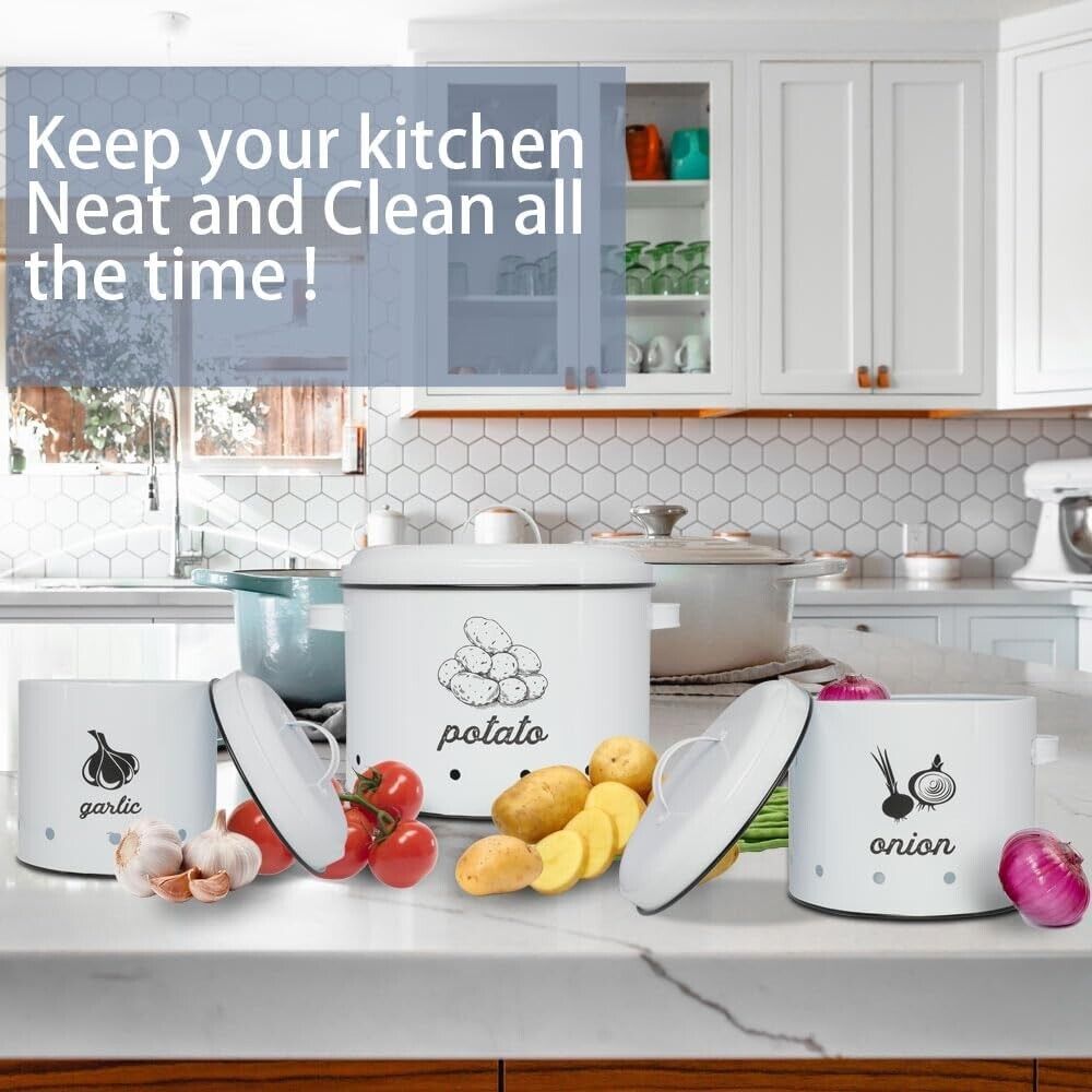 - Experience a Neat and Organized Countertop - Enhance your kitchen's functionality and maintain an orderly space! Our generously sized metal onion pot, complete with a handle lid, offers ample shelf space while exuding an elegant retro charm reminiscent of the 1940s. Ideally suited for storing onions (up to 2.2 lbs), garlic (up to 1 lbs), and potatoes (4.5-5.5 lbs), this storage solution combines style and practicality seamlessly.