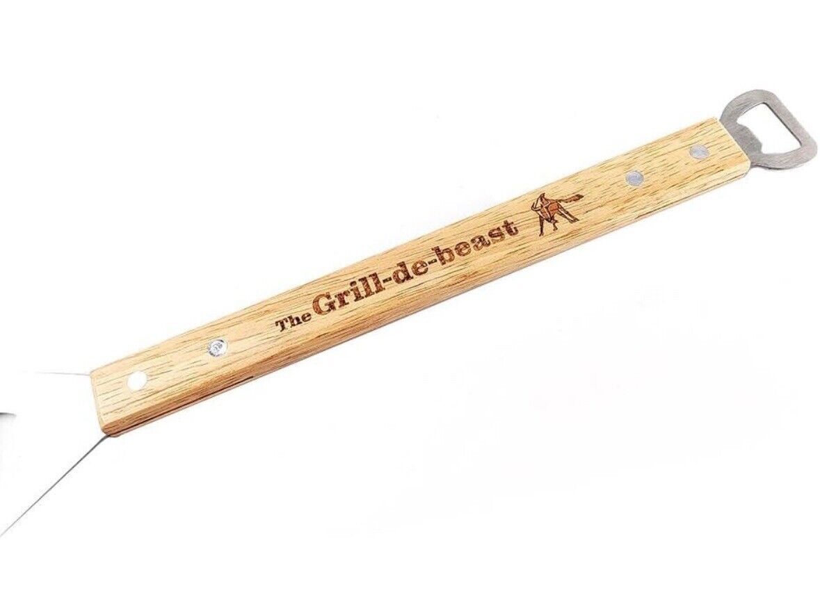 6 in 1 grilling tool Spatula/grill turner with sharp edge, serrated edge, fork/tenderizer edge, plus 2 bottle openers – one on the spatula and one at the end of the engraved wood handle. This Beast is All You Need!! Made of stainless steel with engraved wood handle. Over 18” long! Perfect for everyday grilling. Packaged in our Grill-de-beast logo box. Father’s Day, Summer, Christmas, Birthday, Camping, Anniversary, New Home.