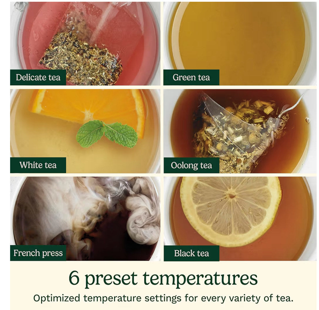 The Cuisinart Electric Kettle is designed for every occasion and equipped with 1500 watts of power for fast heating. This 1.7-liter capacity PerfecTemp electric tea kettle brings up to 1-2/3 liters of water to a boil in a matter of minutes. Better than that, it offers 6 different preset heat settings, which allows for steeping tea at just the right temperature depending on the variety. Using the simple one-touch controls on the kettle's handle, select 160°F for delicate teas, 175°F for green tea, 185°F for white tea, 190°F for oolong tea, 200°F for French press coffee, and Boil for black tea or to make instant cocoa, oatmeal, noodles, and more. Additional features of this Cuisinart kettle include a stay-cool nonslip handle, a lid release button, a blue backlit water window with measurement marks, a concealed heating element to prevent mineral buildup, and a removable, washable scale filter. The Cuisinart tea kettle features a dripless pour spout and boil-dry protection with auto shutoff to provide safety and ease of use. The easy-to-use one-touch controls include a Start button and a Keep Warm button, which maintains your selected temperature for up to 30 minutes. A user manual with recipes comes included. The BPA-free Cuisinart Electric Kettle measures approximately 8.8″ x 6.1″ x 9.75″