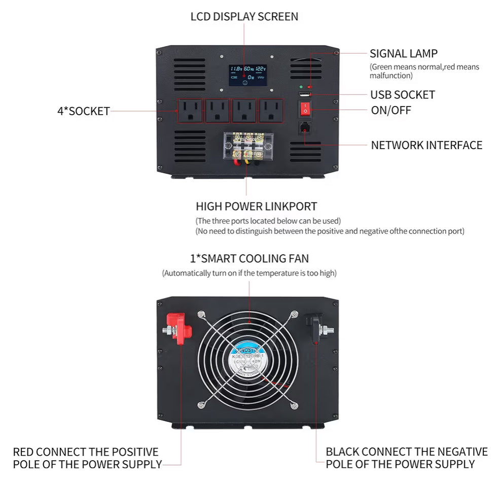 【Travel and Emergency Equioment Essentials】You only need to connect the 3500W power inverter to the 12V battery through a cable, and you can use the 120V AC power supply anytime and anywhere. AC appliances or devices suitable for use in power outages, emergencies, hurricanes, holidays, cars, RVs, trucks, solar energy, remote workplaces, or any place that requires AC power, such as televisions, ovens, floodlights, laptops, DVDs, players, mobile phones, iPads, PSPs, and cameras.