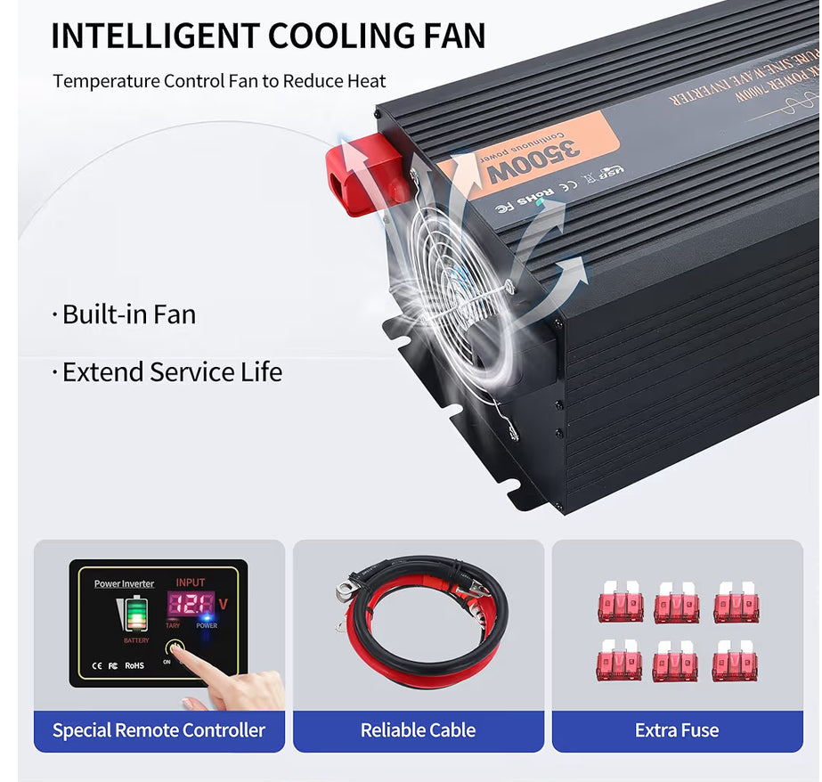 🔋【What You Will Get】The package contains the 3500 watt inverter and all required accessories. Check the power of the appliance and the installation method of the inverter carefully before use. The package includes:① power inverter x1, ②remote control x1,③remote control cable x1, ④remote control sticker x1, ⑤spare fuses x6, ⑥copper power cords x2, ⑦wrench x1, ⑧user manual x1.