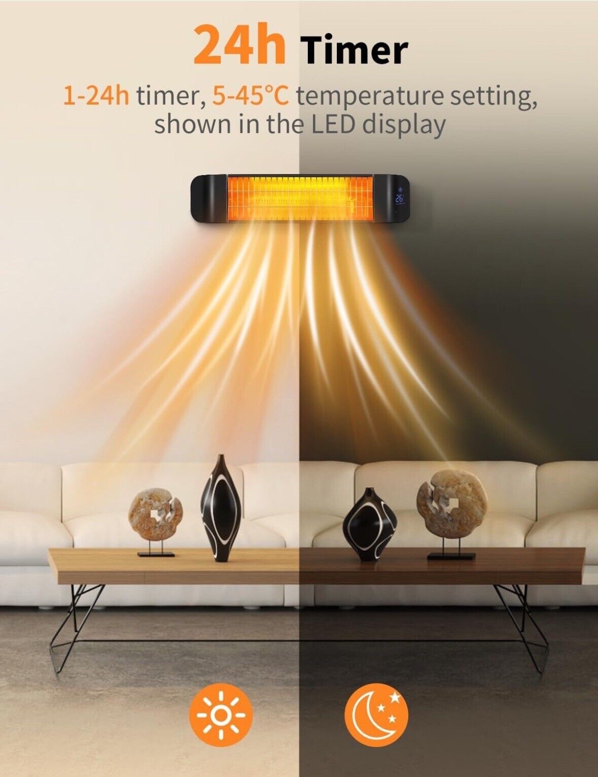 🔥【4 Heat Level】The remote heater has four heating levels to choose from 500W, 900w, 1200w,1500w,uses standard 120V,60Hz.And it can adjust the mounting angle from 0°-45°. To meet your requirements for use in different scenarios. The temperature setting range is 5℃-45℃. Timing is also possible via remote control and can be set for up to 24 hours. These settings are shown in the LED display for easy reading